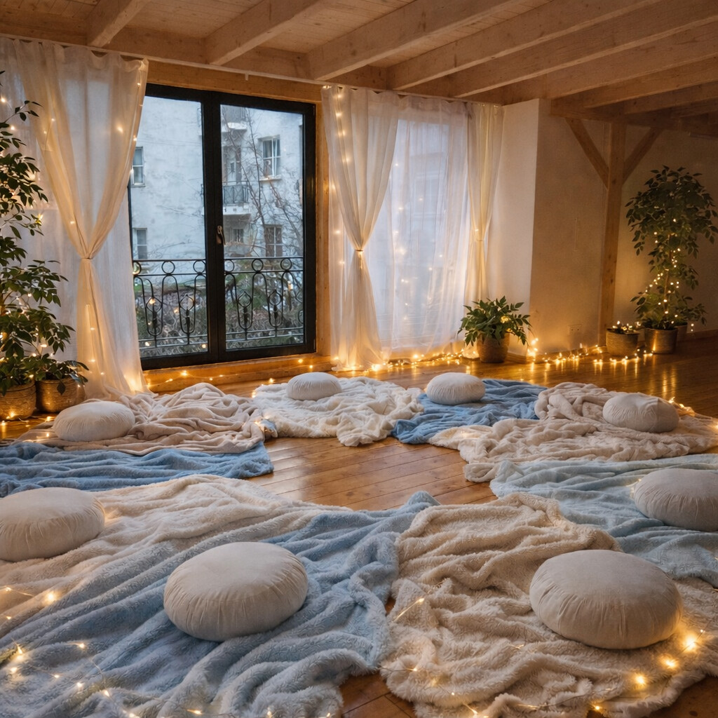 The gathering takes place in a cozy and spacious private setting designed to feel both safe and inviting. Wrapped in soft blankets and surrounded by the gentle glow of candles, we will enjoy hot chocolate and chai lattes while the soft scent of palo santo fills the air.